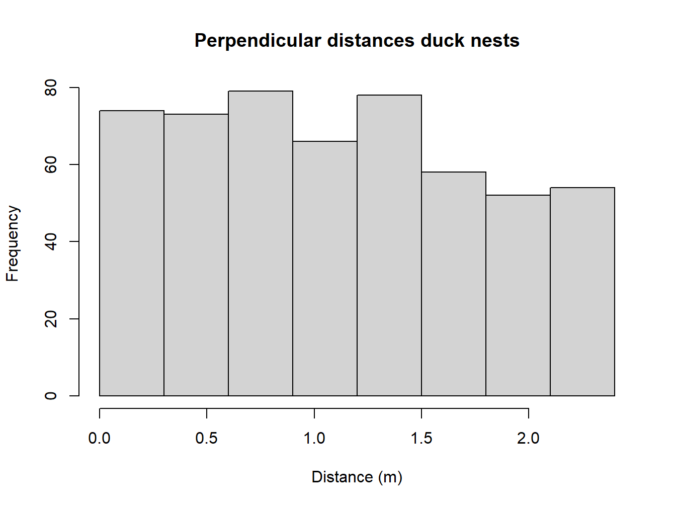 Distribution of duck nest perpendicular distances. Should match the bar heights from table in Practical 1.