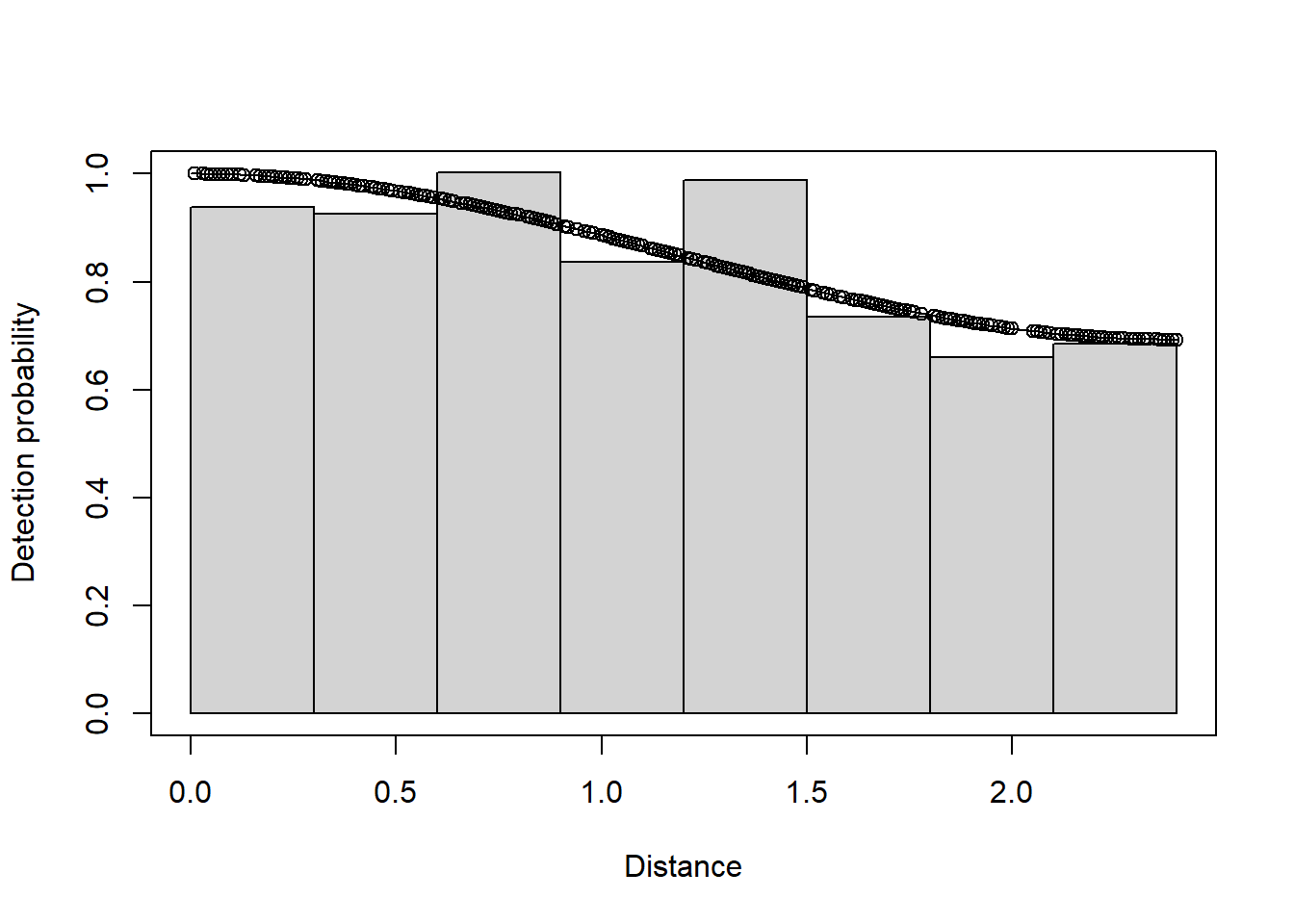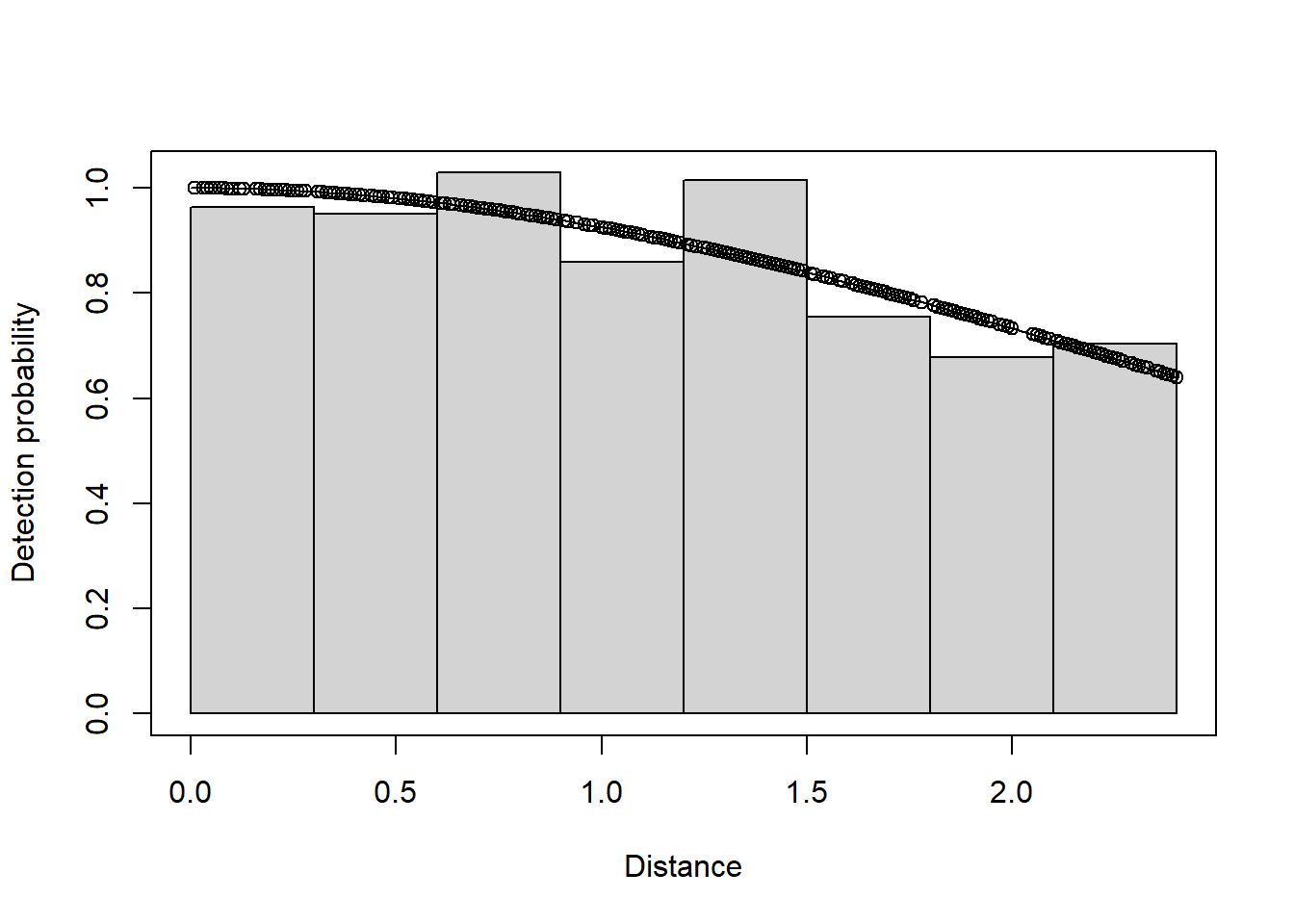conversion.factor <-convert_units("Meter", "Kilometer", "Square Kilometer")# Half-normal with no adjustmentsnest.hn <-ds(ducknest, key="hn", adjustment=NULL, convert_units=conversion.factor)summary(nest.hn)