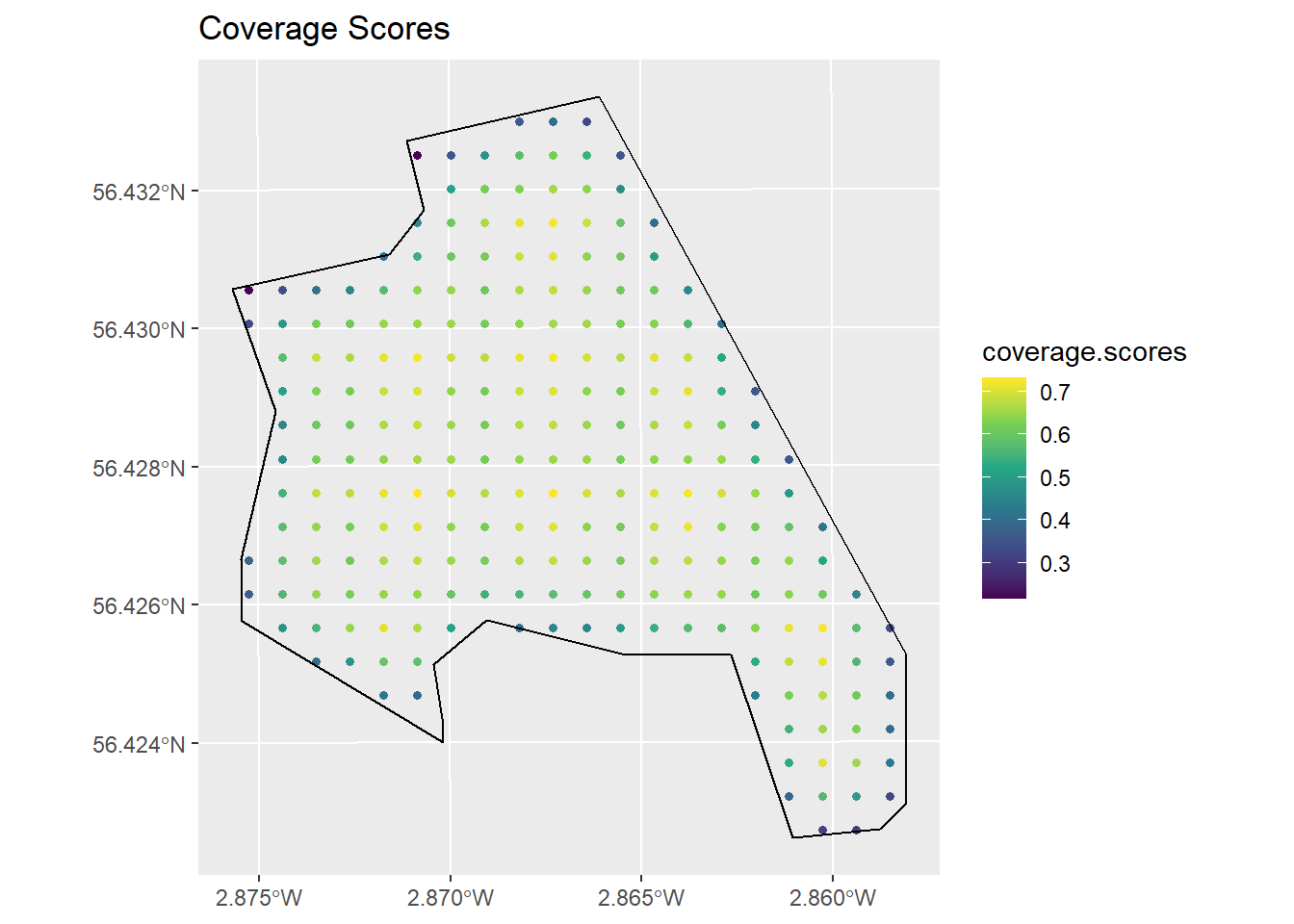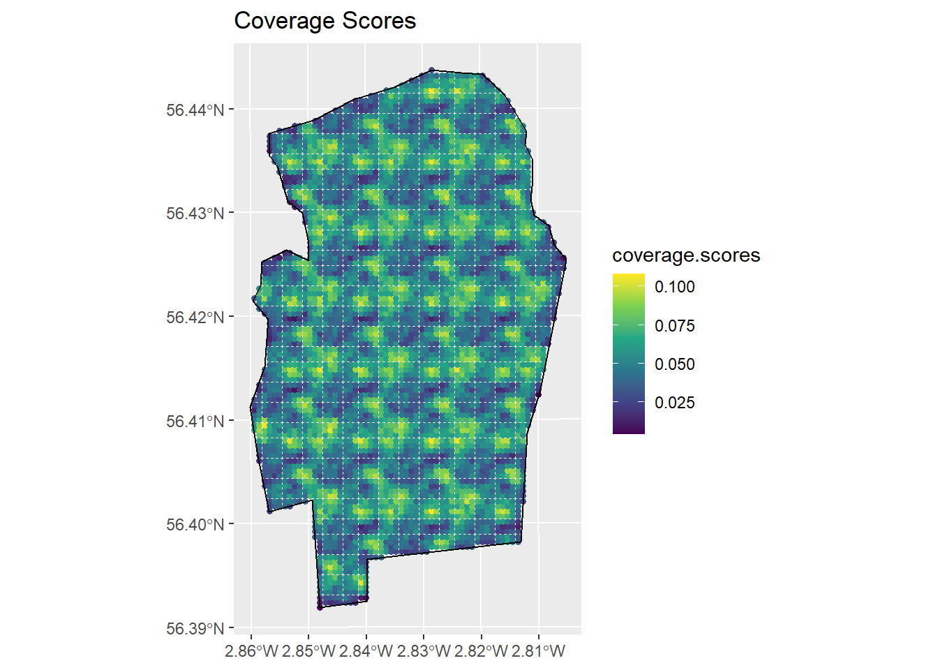 The main strata looks to have fairly uniform coverage. The values appear to have such small levels of variability that the variability that is seen will be down to stochasticity as it is seen across the entire strata. The Morton Lochs strata we can see has areas of lower coverage around the edge of the study region. This grid is a bit too coarse to allow us to properly judge how much of an issue edge effects will be in this strata. It may be wise to re-run the coverage simulation with a finer coverage grid and more repetitions too. Edge effects could potentially be problematic in such small areas.