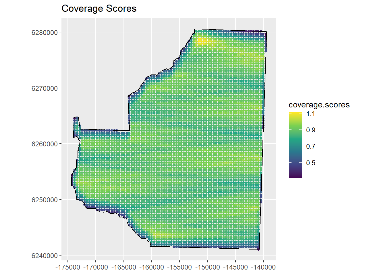 Do you think the coverage scores look uniform across the study region? Where are they higher/lower? Why do you think this is?