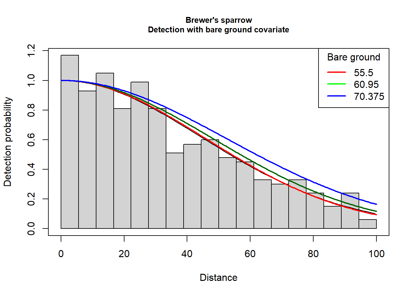 plot(woo.bare, showpoints=FALSE, main="Brewer's sparrow\nDetection with bare ground covariate", pdf=pointtransect)