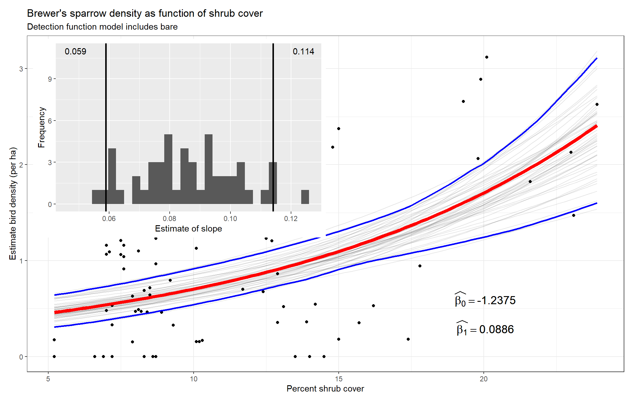slope.est <- vector("numeric", length=nboot)Specify the original site data frame sparrowSiteData in the following code. The code will harvest the estimated slope and intercept coefficients from each replicate. It is uncertainty in the slope coefficient (\(\widehat{\beta_1}\)) that determines our inference about the effect of shrub cover upon Brewer’s sparrow density. The uncertainty in the slope coefficient as calculated by the code below differs from the uncertainty reported in Table 1 because below we are incorporating uncertainty in the relationship induced by uncertainty in the detection function, which is not recognised in Table 1.